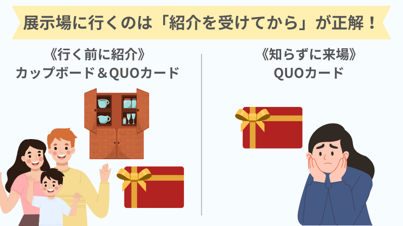 展示場に来場さえしていなければ特典は受け取れるので、行く前までに必ず紹介を受けておきましょう!