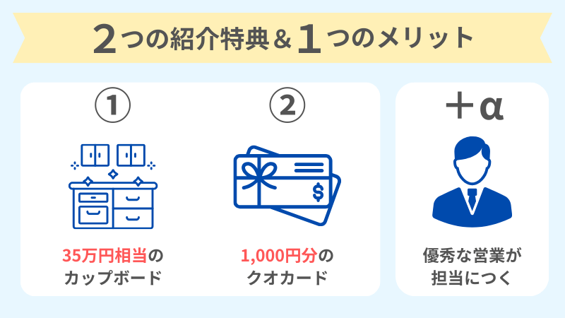 そのため、事前に知っておくだけで誰でも実質的な割引が受けられるのが、紹介制度の「カップボード特典」なのです。