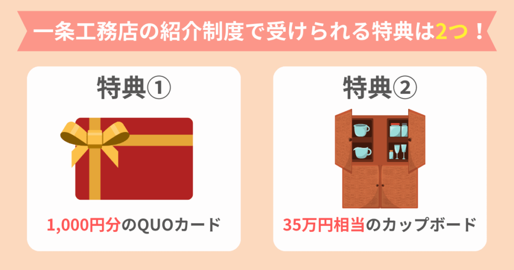 結論からお伝えすると、一条工務店の紹介制度を利用すると、以下の2つの特典+1つのメリットを受けられます。