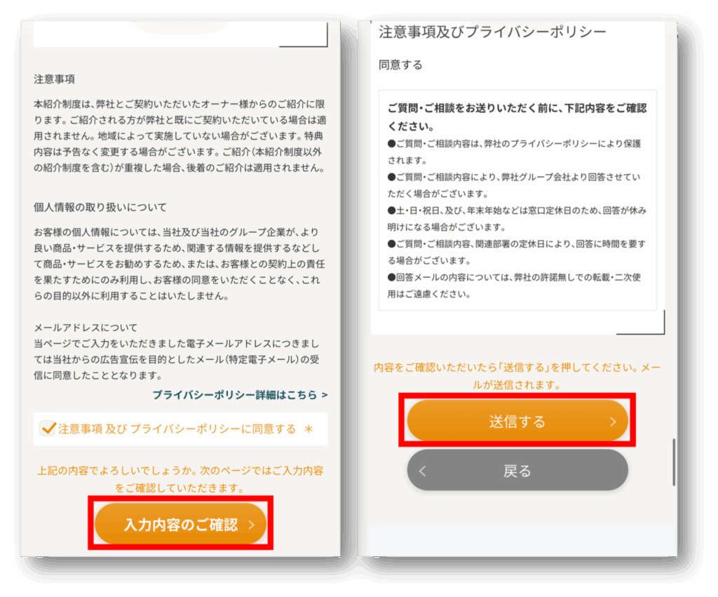 入力が完了したら、規約に同意して「入力内容のご確認」をタップしてください。