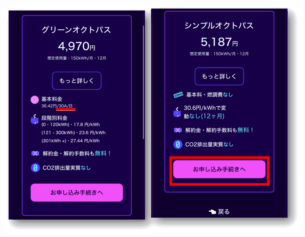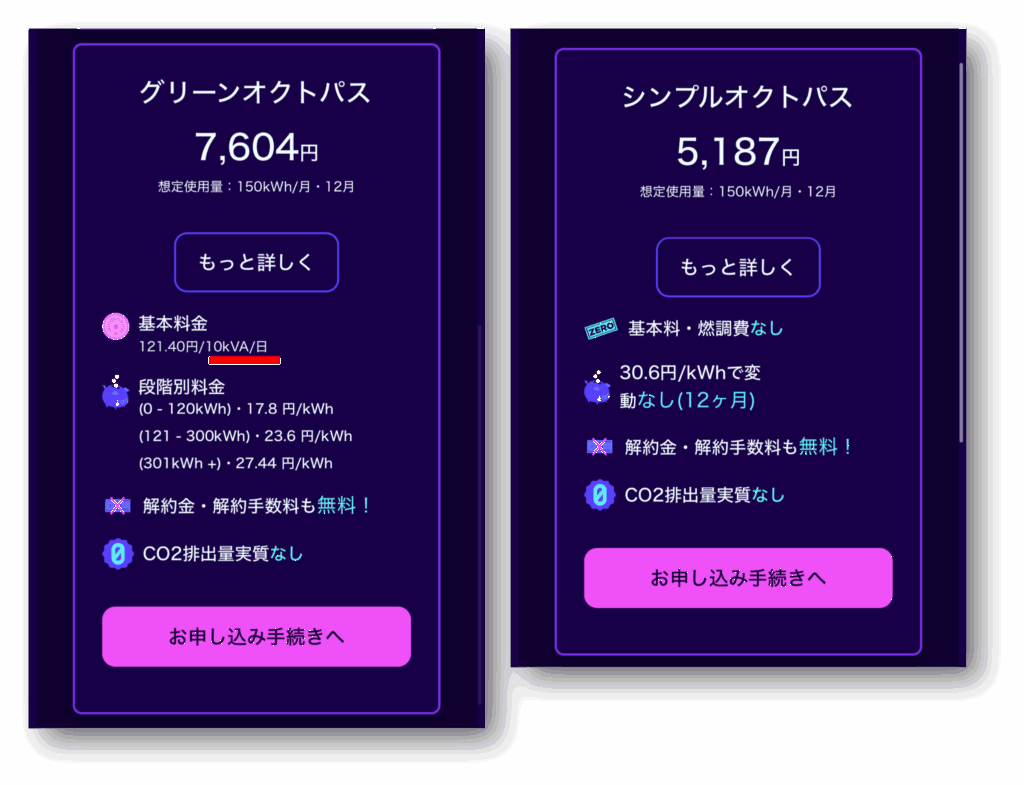 そのため、「グリーンオクトパス」の方が安く表示されることがありますが、太陽光&蓄電池が設置してある家では「シンプルオクトパス」を選んで問題ありません。