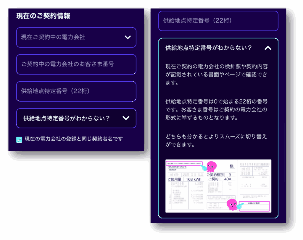 申し込みには、「供給地点特定番号」と「お客様番号」が必要なので、この2つが分かれば切り替え可能です!