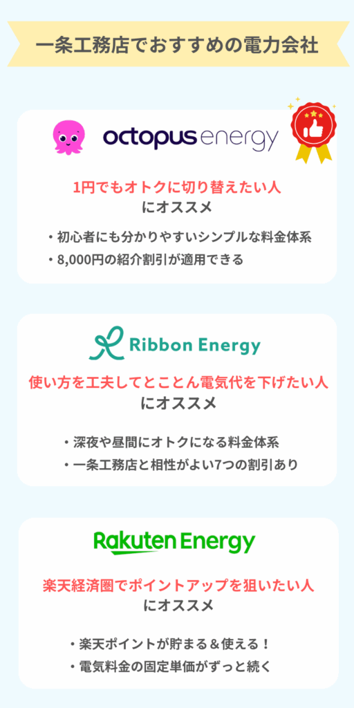 結論からいうと、一条工務店で最もおすすめの電力会社は「オクトパスエナジー」です。