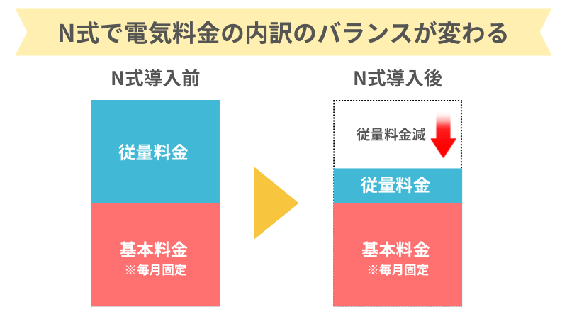 そして、N式を導入して買電量が少なくなると、毎月の支払いの中で「使った分だけ払う料金(従量料金)」が安くなります。