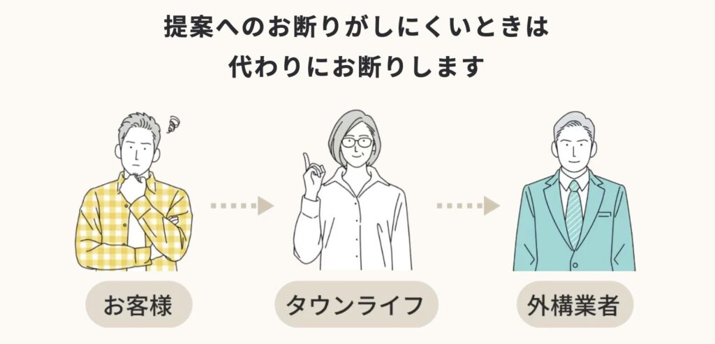 しかし、タウンライフ外構なら、そんな時にも外構業社との間に入って代わりにお断りしてくれます。